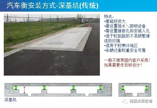 無基坑注意事項(xiàng):需要澆筑混凝土引坡,車輛上衡相對(duì)較難.必要時(shí)需要配套安全護(hù)欄。出于安全考慮,一般無基坑的汽車衡安裝高度控制在0.5m左右。